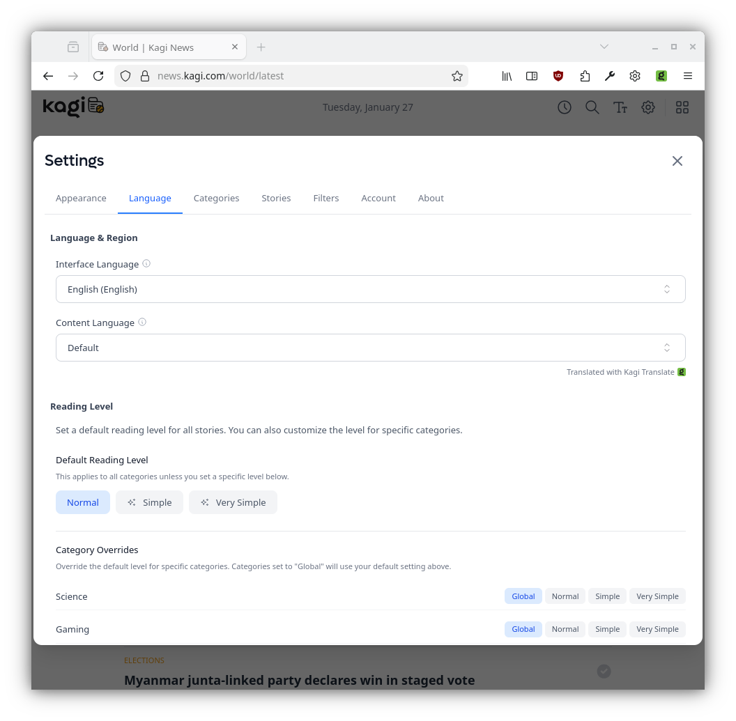 Kagi News はまだベータ版で,今のところアカウント無しで使えるっぽい1。 ただ,この見た目なので日本語には対応していないと今まで思っていた。 よく見ると設定で表示言語は変えられるようだ。