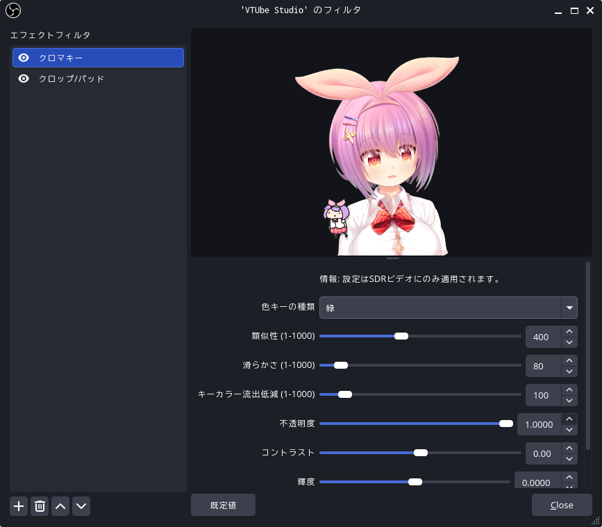 VTube Studio をソースとして OBS Studio に取り込んでフィルタを設定したところ。