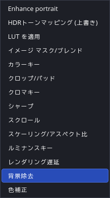 色々とググってみると「背景除去」を「音声/映像フィルタ」から追加するみたいな記述ばっかりで「そんなのねーよ!」とひたすら悩んだ。どうも古いバージョンでは,本当に「音声/映像フィルタ」から Background Removal を追加して抜いた背景の色を(緑などに)指定し,その上で「エフェクトフィルタ」の「クロマキー」で指定した色を透過にする手順だったようだ。 ↩︎