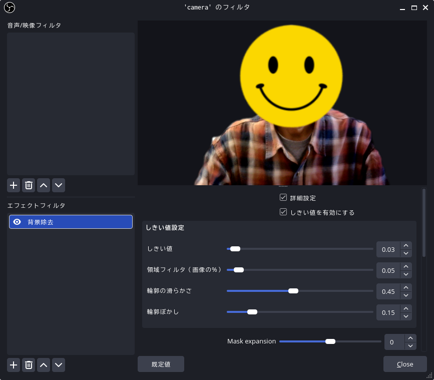 ソースに追加したカメラの「フィルタ」を開いて「エフェクトフィルタ」から「背景除去(Background Removal)」を追加する(「音声/映像フィルタ」は弄らなくてよい1)。