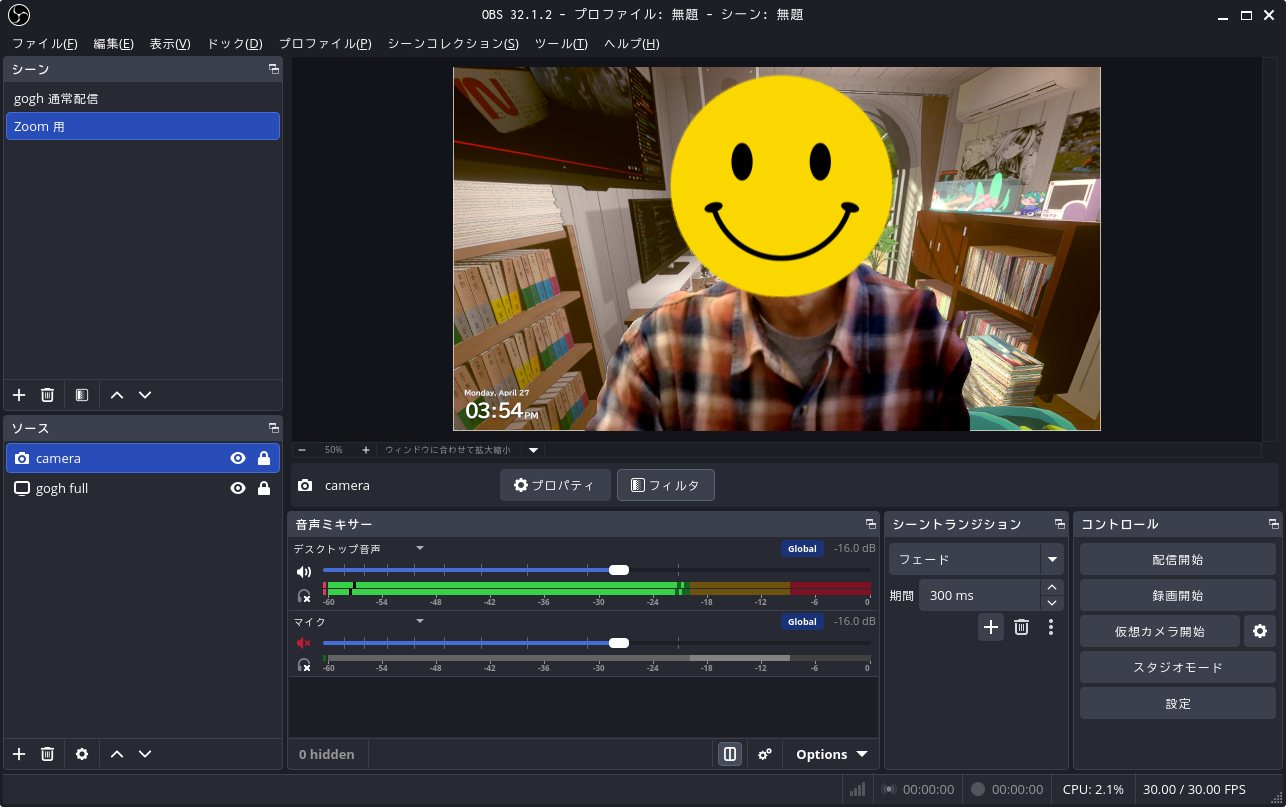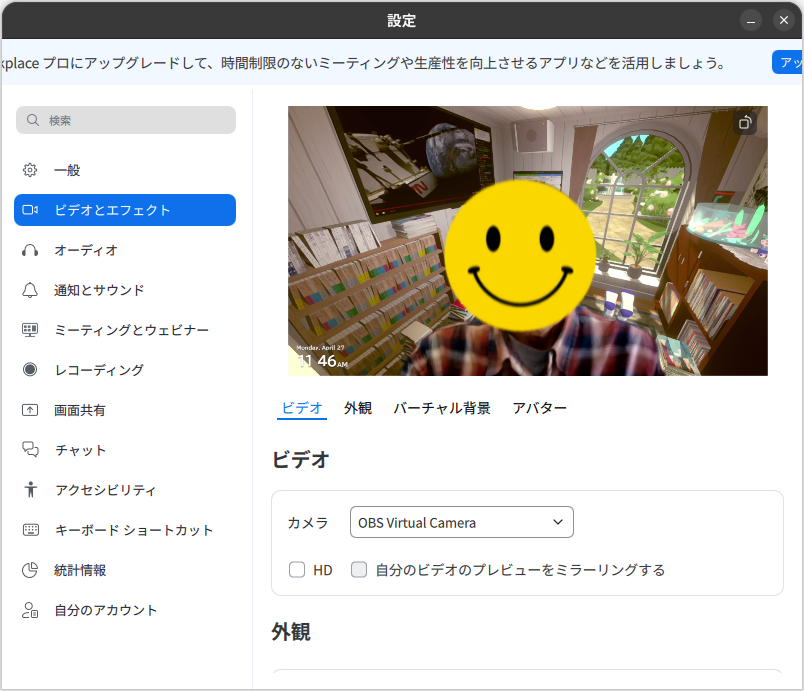 この前の読書会のときに Zoom カメラの背景を gogh のスクリーンショットにしてたんだけど,どうせなら背景が動いたらいいよね。 でも Zoom 単体の機能では Web カメラの背景を削除することはできるけど,背景として別の動画を合成するのは難しそう,というかできない? じゃあ OBS Studio の仮想カメラの機能を使って OBS の合成映像を Zoom に出せばいいんじゃないか? というわけで,実際にやってみることにした。