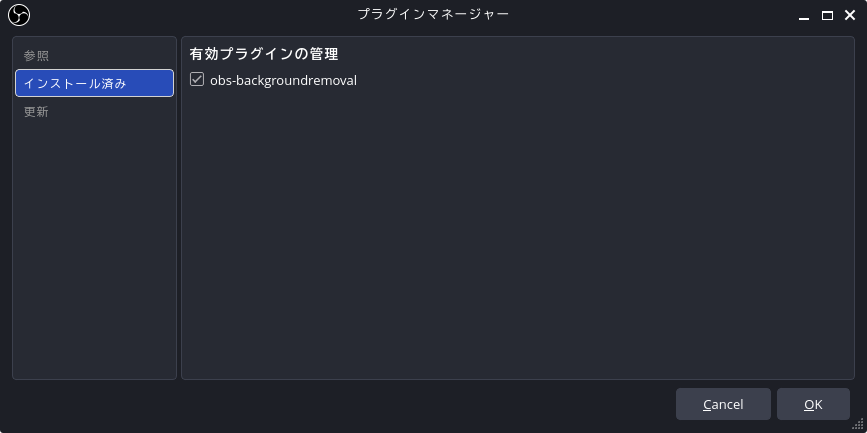 インストール後 OBS Studio を起動し直し [ツール] → [プラグインマネージャー] を開いて obs-backgroundremoval がインストール済みで有効になっていることを確認する。